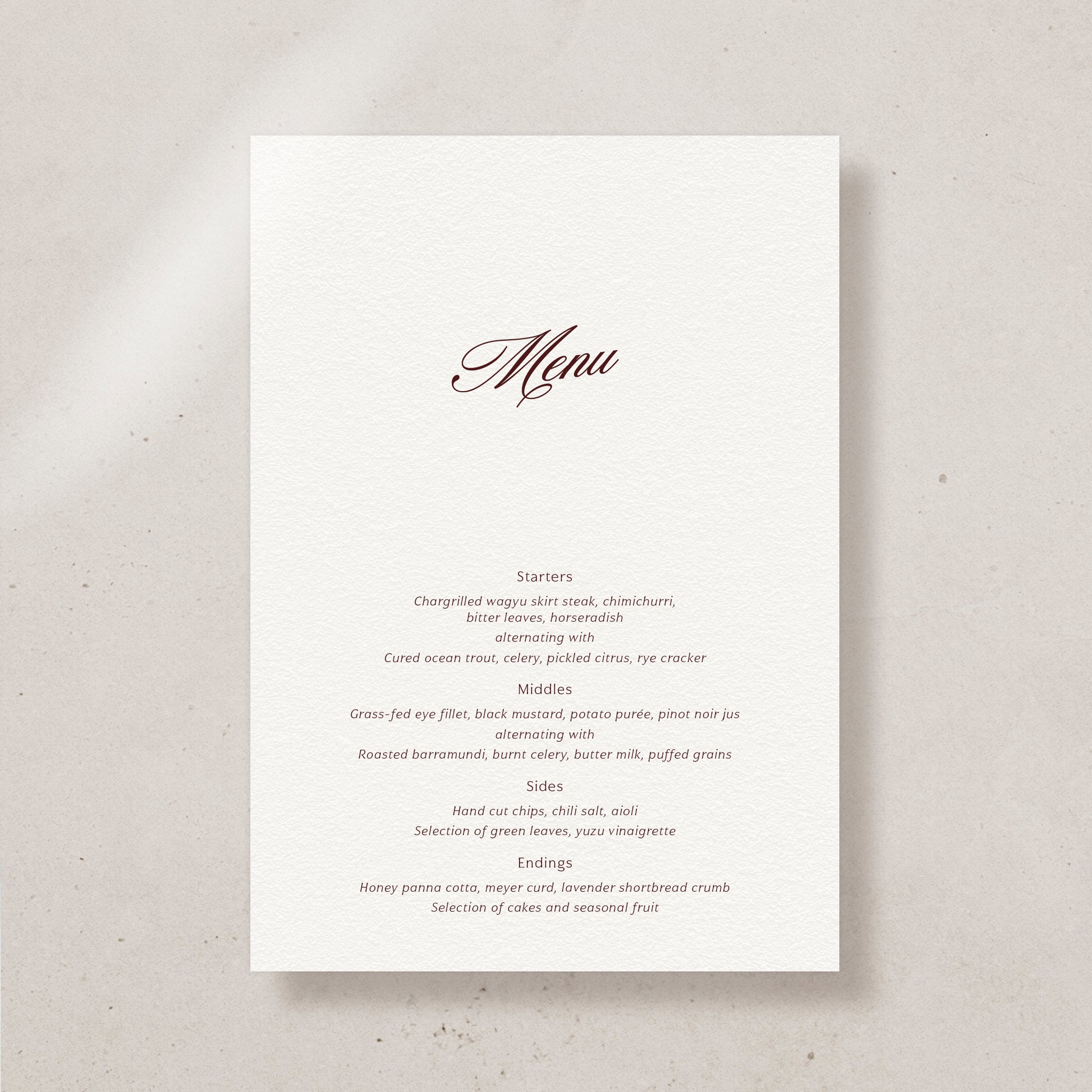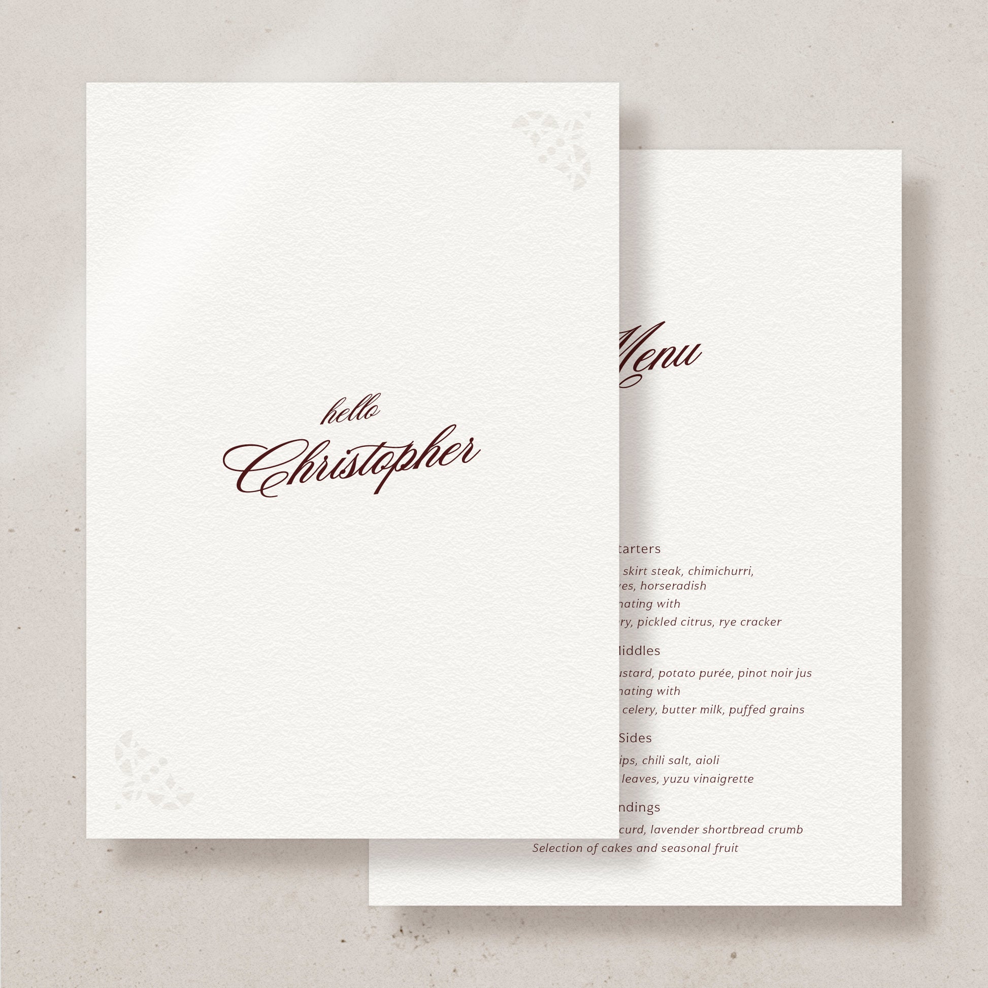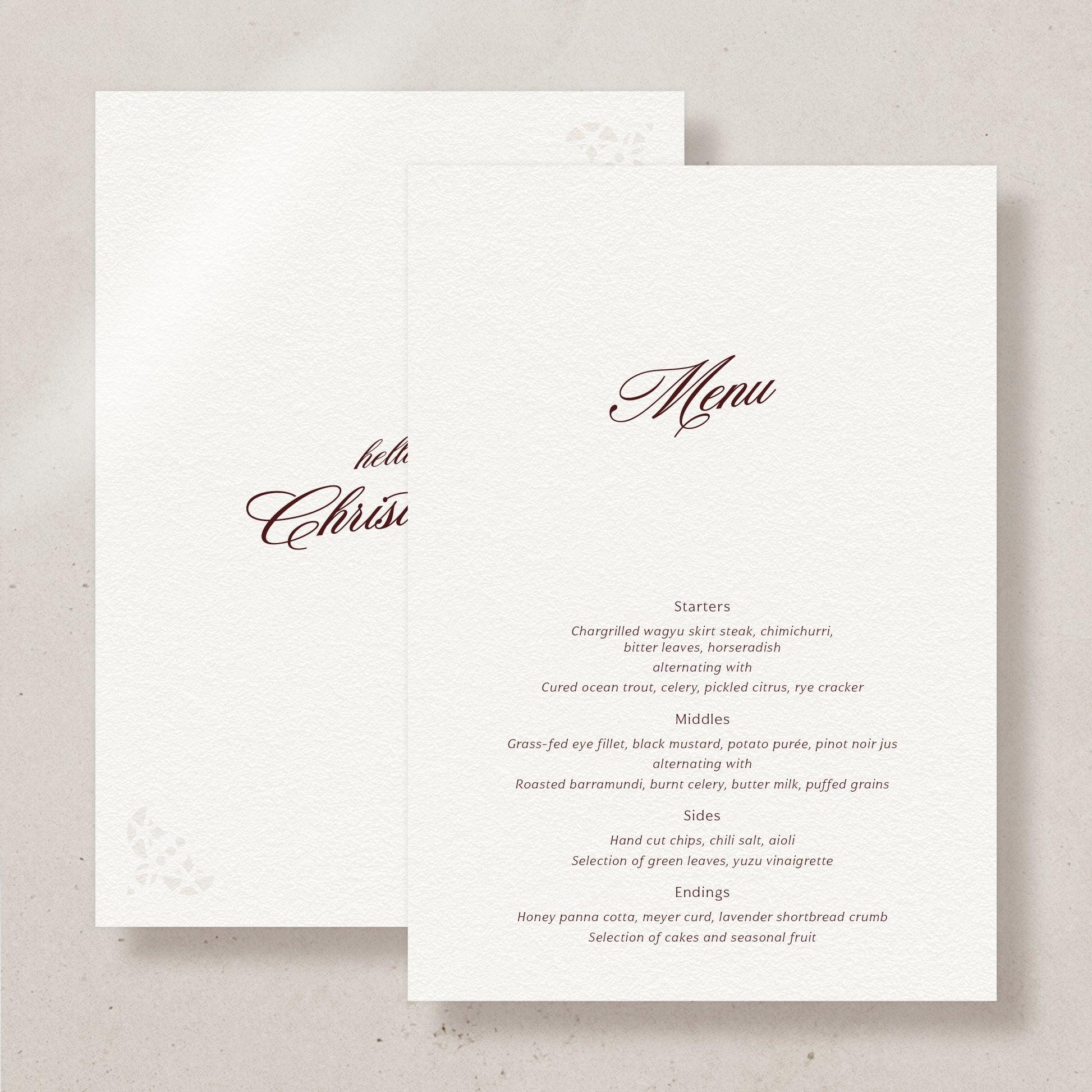 Continue your collection theme right down to the menus, and we know every guest stares down the food as it comes. Choose to personalise these or keep them generic.